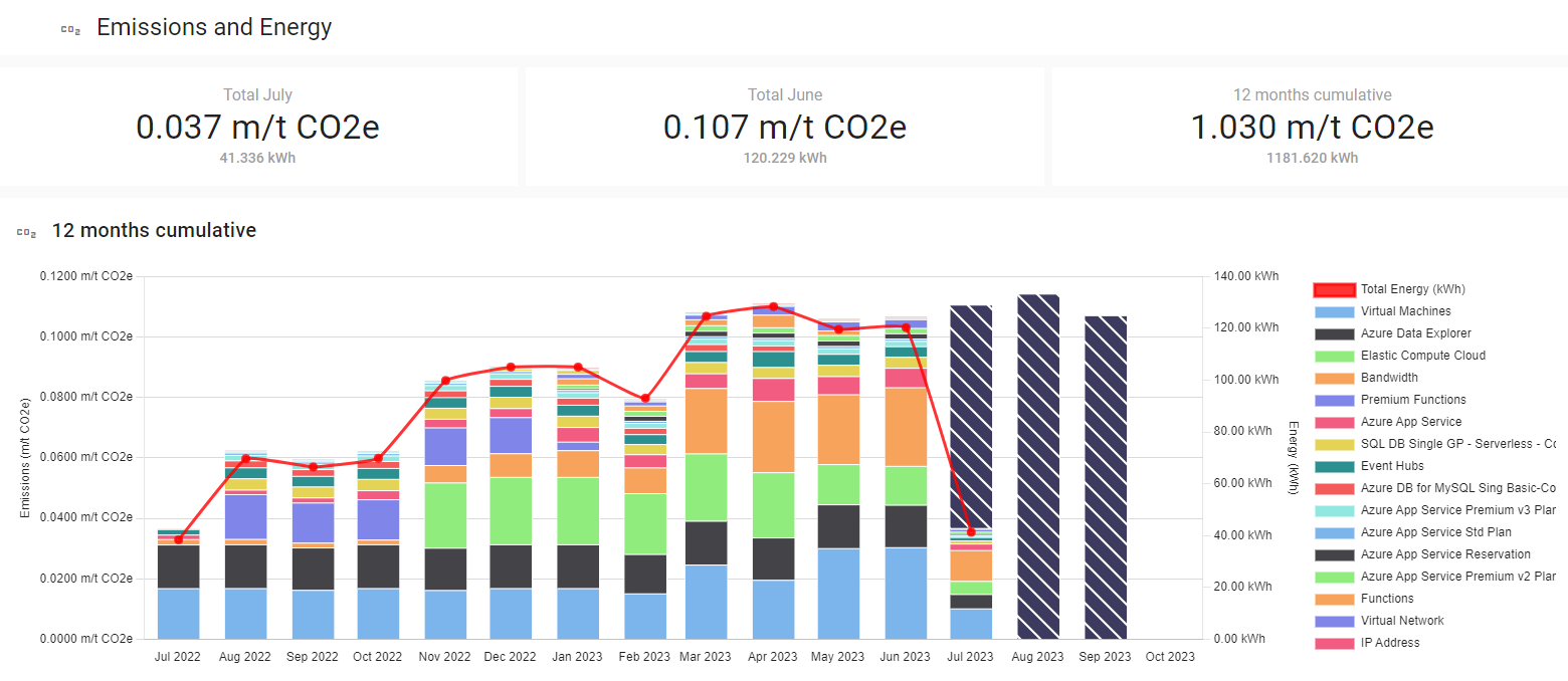 DATACOM Portal Emissions and Energy provides an overview of Carbon Dioxide produced and KiloWatt hours consumed for all cloud accounts. It shows the projected emissions and energy for the current month, the totals for the previous month, as well as the cumulative totals for the year to date. Emissions and Energy are calculated using the model provided by the Cloud Carbon Footprint project.